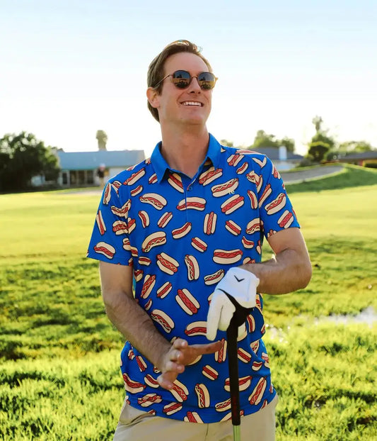 Tipsy Elves - Hot Dog Men's Golf Shirt - Blue Summer Golf Polo: 3XL