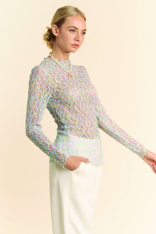 Multi Printed Loose Turtle Neck Lace Mesh Top