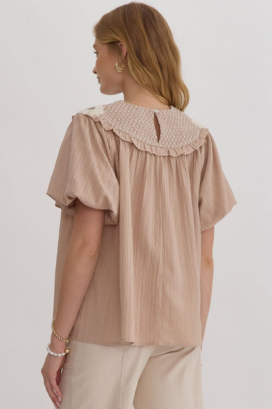 Mocha Smocked Babydoll Top w/Floral Details