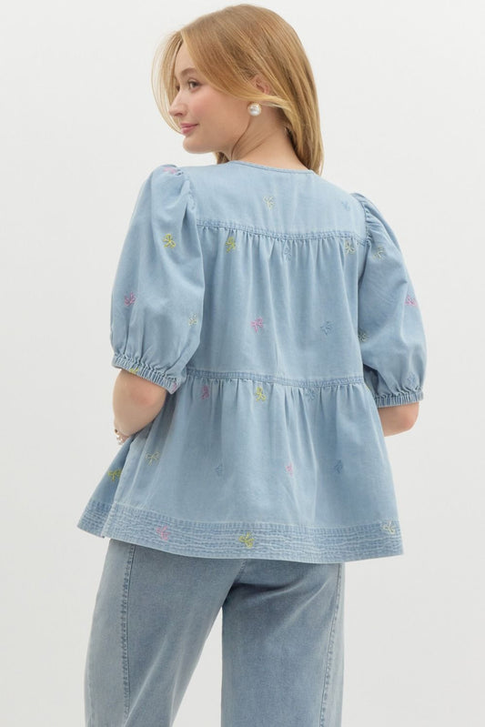 Sold outBow Embroidered Denim Top