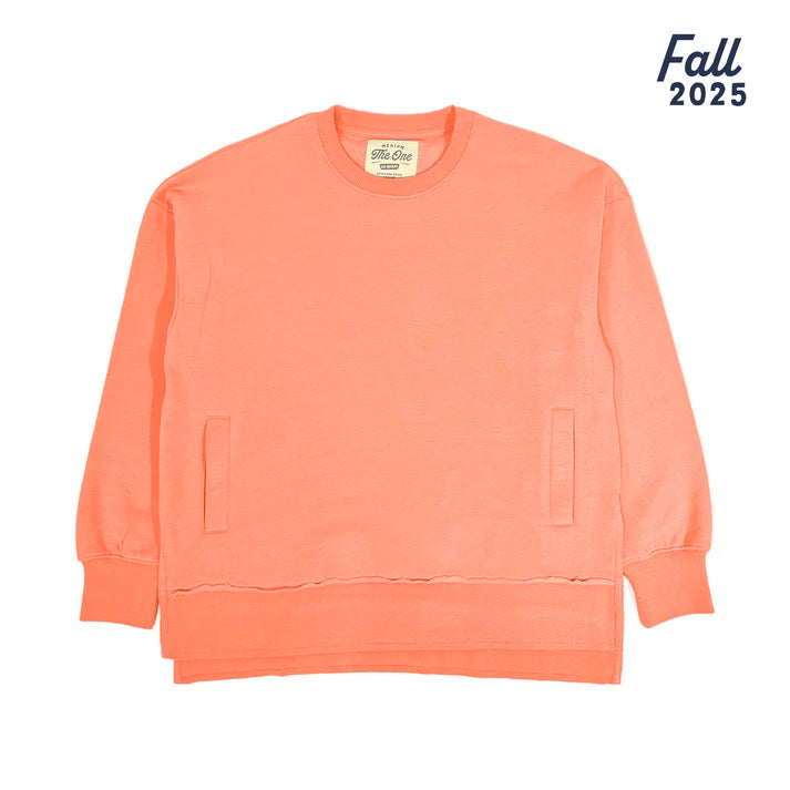 The One oversized crewneck fleece, the perfect blend of comfort and style. Featuring a drop tail, split seam, side pockets, and a vintage wash for a timeless look