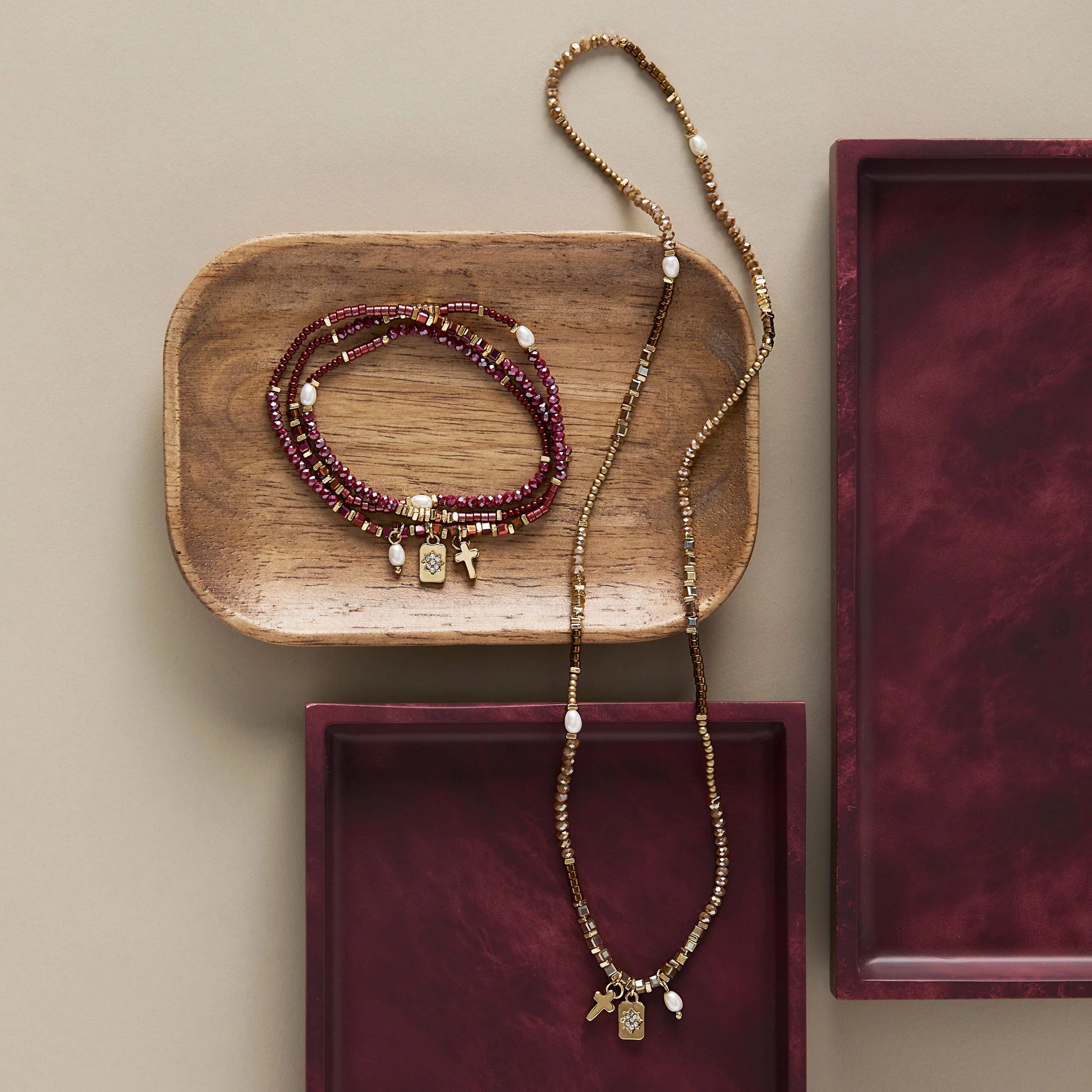 Curated carded jewelry for that meaningful perfect grab-and-go gift. Beautifully carded and ready to gift. Comes on a sweet sentiment card. Wrap bracelet can also be worn as a necklace. Materials: Mixed Alloy, Glass Bead, Imitation Pearl.